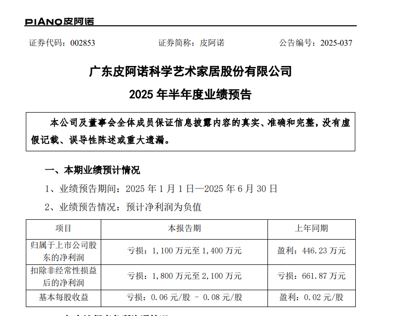 乐居财经李兰 7月14日,皮阿诺(002853.SZ)发布2025年半年度业绩预告。