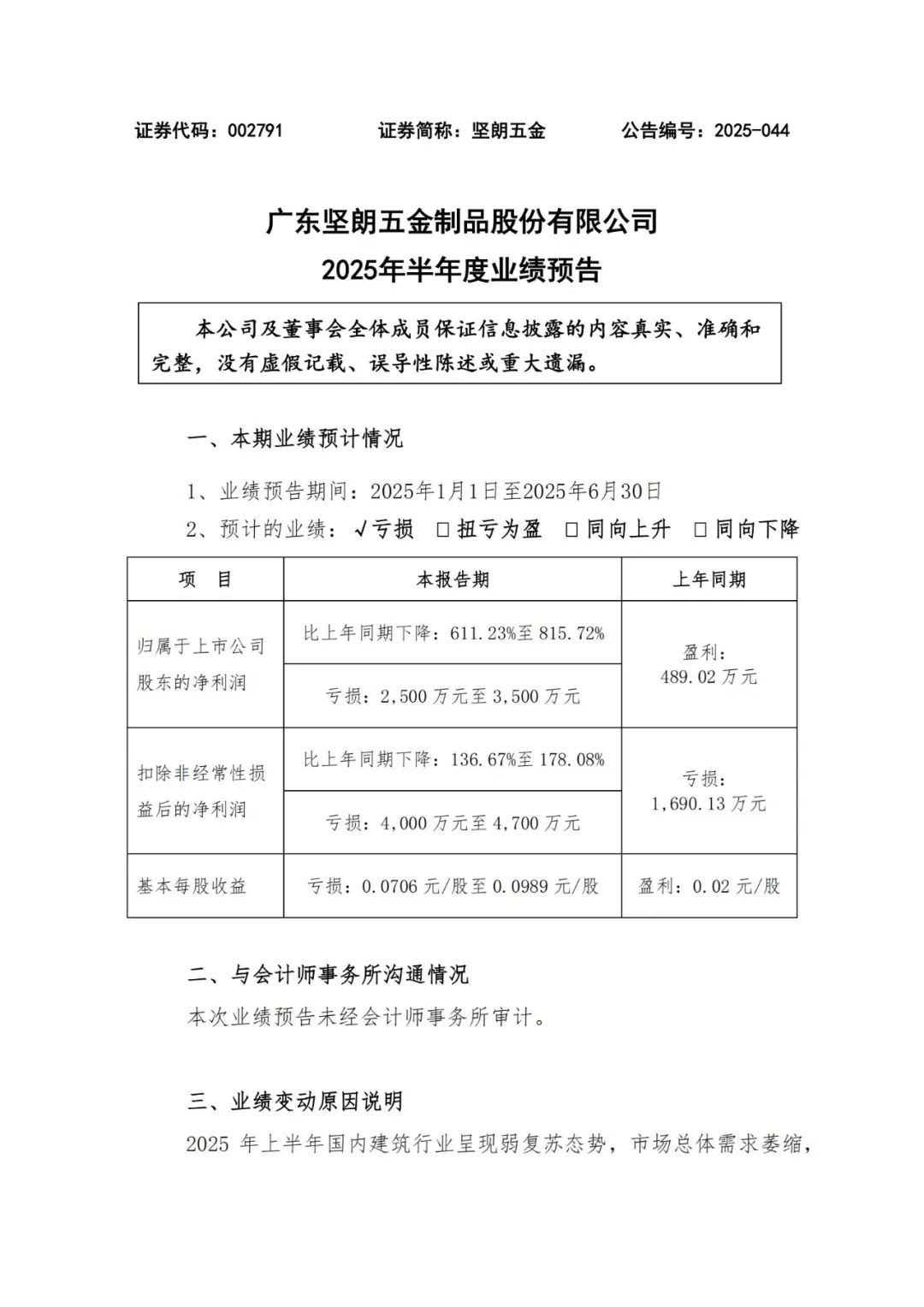 坚朗五金预计2025年上半年归属于上市公司股东的净利润亏损2500万元至 3500万元,比上年同期下降611.23%至815.72%;扣除非经常性损益后的净利润亏损4000万元至 4700万元,比上年同期下降136.67%至178.08%。
