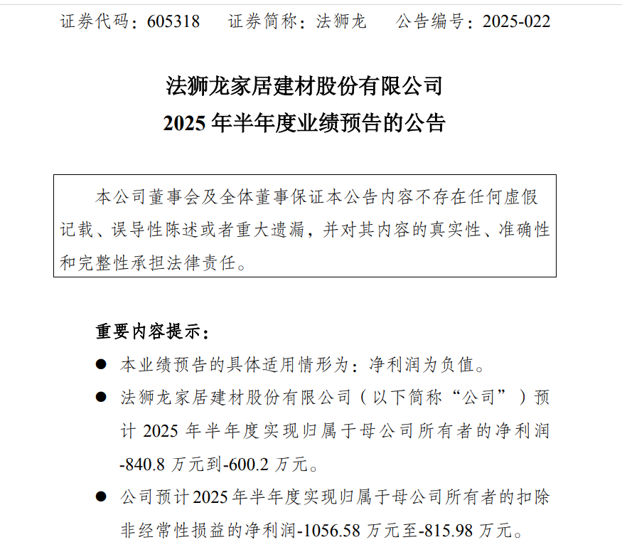 7月12日,法狮龙(605318.SH)发布2025年半年度业绩预告。