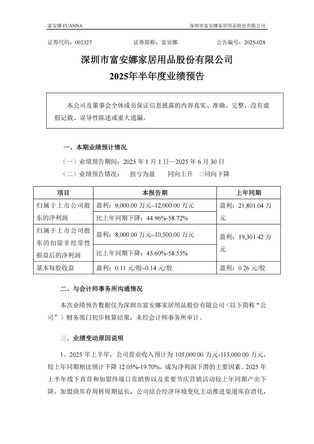 富安娜(002327)预计盈利9000万元至1.2亿元,同比下降44.96%至58.72%;营业收入10.5亿元至11.5亿元,同比下滑12.05%至19.7%。业绩变动原因如下: