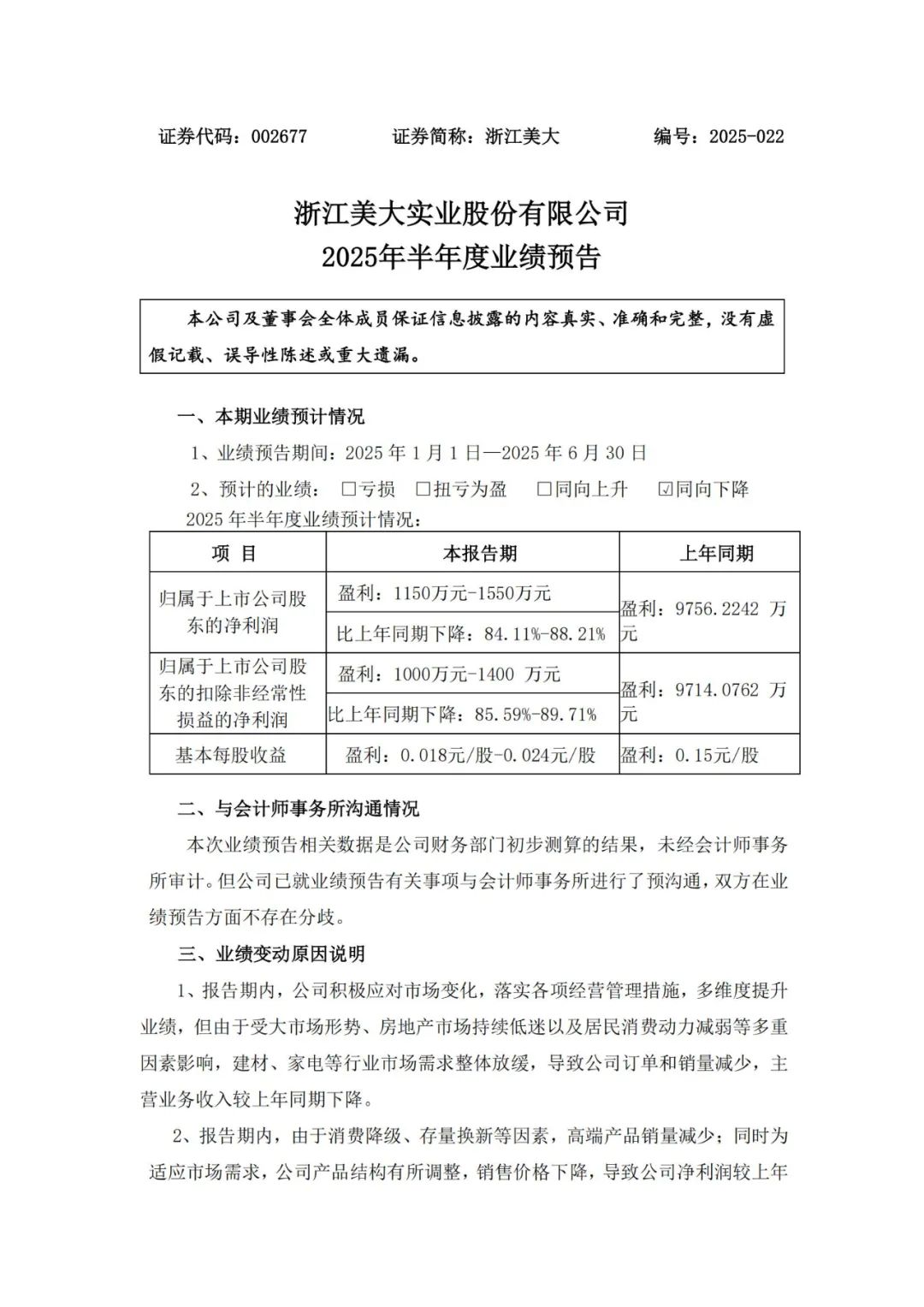 浙江美大预计2025上半年归属于上市公司股东的净利润1150万元-1550万元,比上年同期下降84.11%-88.21%;归属于上市公司股东的扣除非经常性损益的净利润1000万元-1400 万元,比上年同期下降85.59%-89.71%。