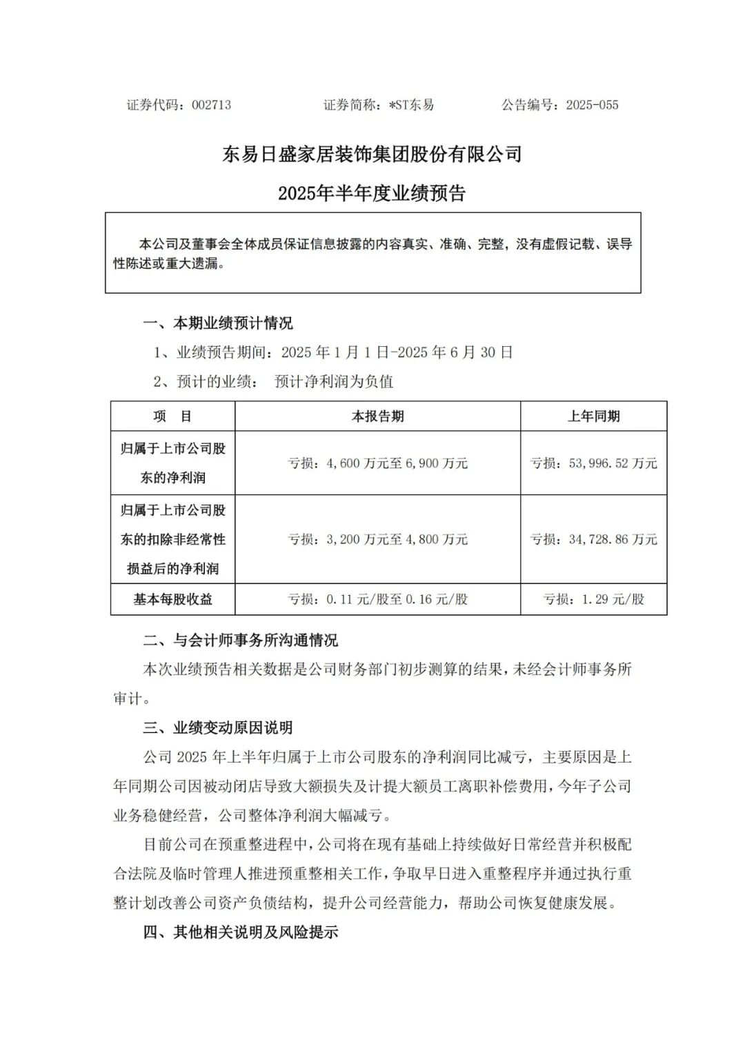 *ST东易(002713)预计亏损4600万元至6900万元,上年同期亏损5.4亿元;扣非后亏损3200万元至4800万元,子公司经营趋稳。