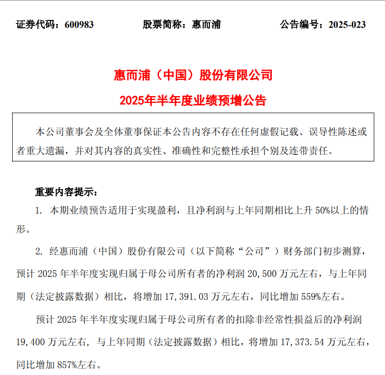 7月5日,惠而浦(sh600983)发布2025年半年度业绩预告。