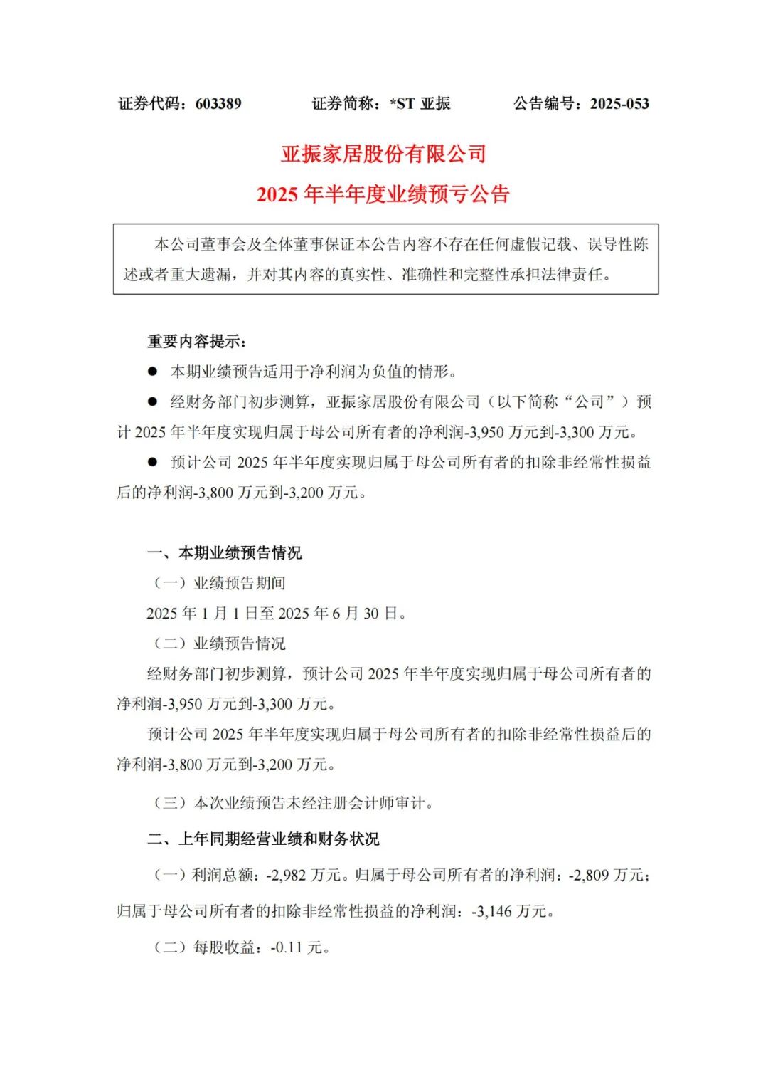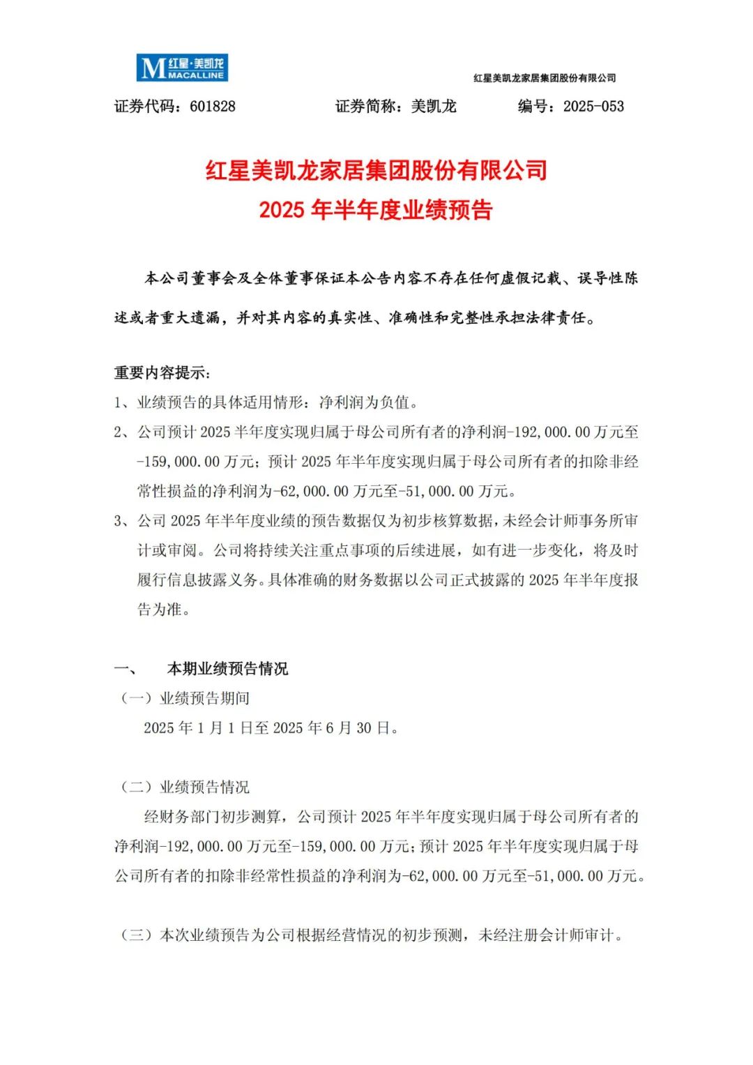 蒙娜丽莎预计2025上半年归属于上市公司股东的净利润亏损320万元-630万元;比上年同期下降103.87%-107.63%;扣除非经常性损益后的净利润亏损1520万元-1830万元,比上年同期下降122.11%-126.62%。