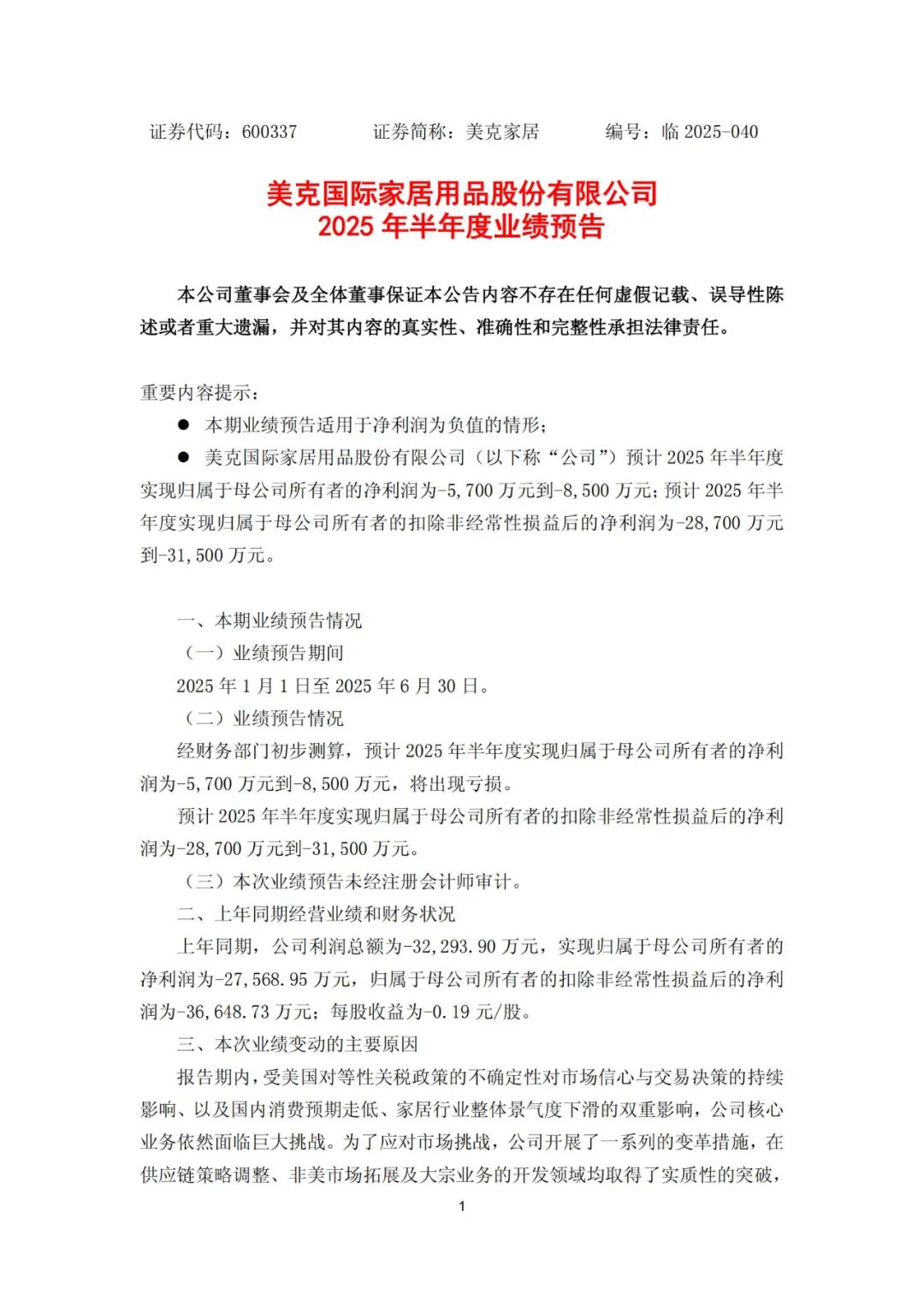 美克家居表示,报告期内,受美国对等性关税政策的不确定性对市场信心与交易决策的持续影响、以及国内消费预期走低、家居行业整体景气度下滑的双重影响,公司核心业务依然面临巨大挑战。为了应对市场挑战,公司开展了一系列的变革措施,在供应链策略调整、非美市场拓展及大宗业务的开发领域均取得了实质性的突破,同时在渠道模式及组织模式上也积极推动变革。