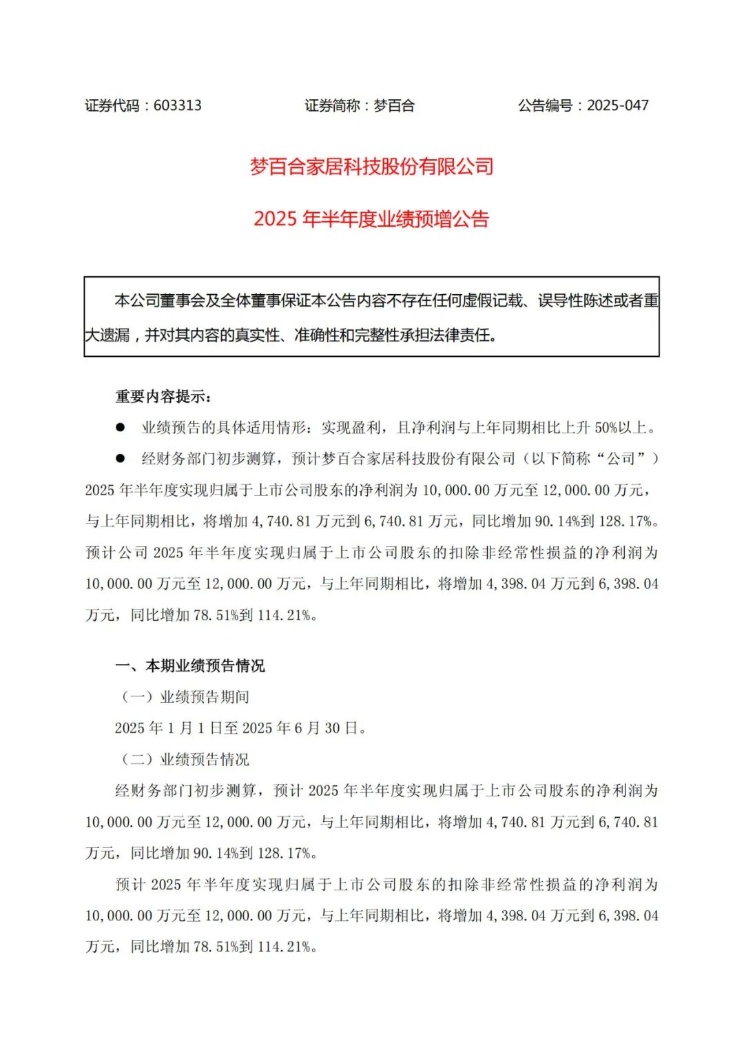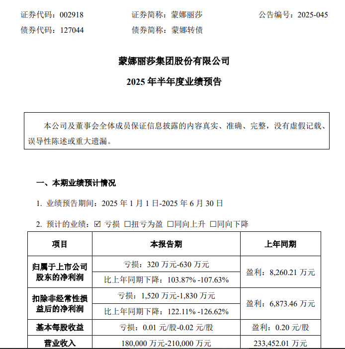 7月11日,蒙娜丽莎(002918.SZ)发布2025年半年度业绩预告。