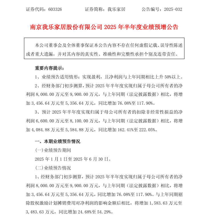 7月8日,定制家居行业上市公司南京我乐家居股份有限公司(以下简称“我乐家居”)发布2025年半年度业绩预告,经财务部门初步测算,预计公司2025年上半年实现归母净利润8000万元至9900.00万元,同比增长76.08%至117.90%;扣非后归母净利润6600万元至8100万元,同比增长162.41%至222.05%。