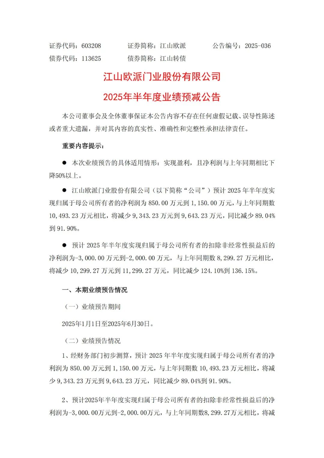 江山欧派预计2025年半年度实现归属于母公司所有者的净利润为850万元到 1150万元,同比减少89.04%到91.90%;预计2025年半年度实现归属于母公司所有者的扣除非经常性损益后的净利润为-3000万元到-2000万元,同比减少 124.10%到136.15%。