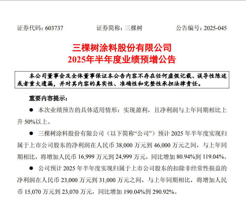 三棵树预计2025 年半年度实现归属于上市公司股东的净利润在人民币38,000 万元到46,000万元之间,与上年同期相比,将增加人民币16,999万元到24,999万元,同比增加80.94%到119.04%。扣除非经常性损益的净利润在人民币23,000万元到31,000万元之间,与上年同期相比,将增加人民币15,070万元到23,070万元,同比增加190.04%到290.92%。