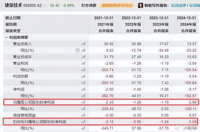 数据显示,2021年-2024年,捷荣技术已连续四年录得归母净利润亏损。根据1月31日发布的业绩预告,其预计2025年归母净利润为-3.97亿元左右,较上年同期亏损进一步扩大。