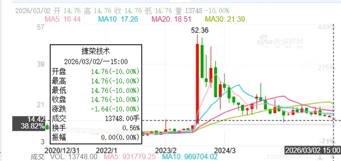 3月2日,昔日华为概念牛股捷荣技术,股价开盘即一字跌停,直至收盘。