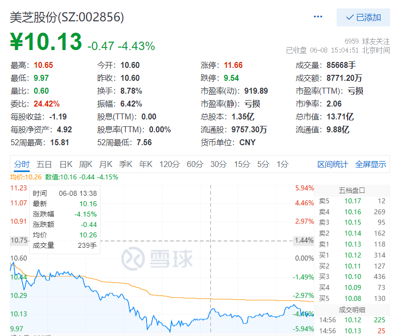 截至当日收盘,美芝股份(002856.SZ)股价跌4.43%,报10.13元,总市值为13.71亿元。