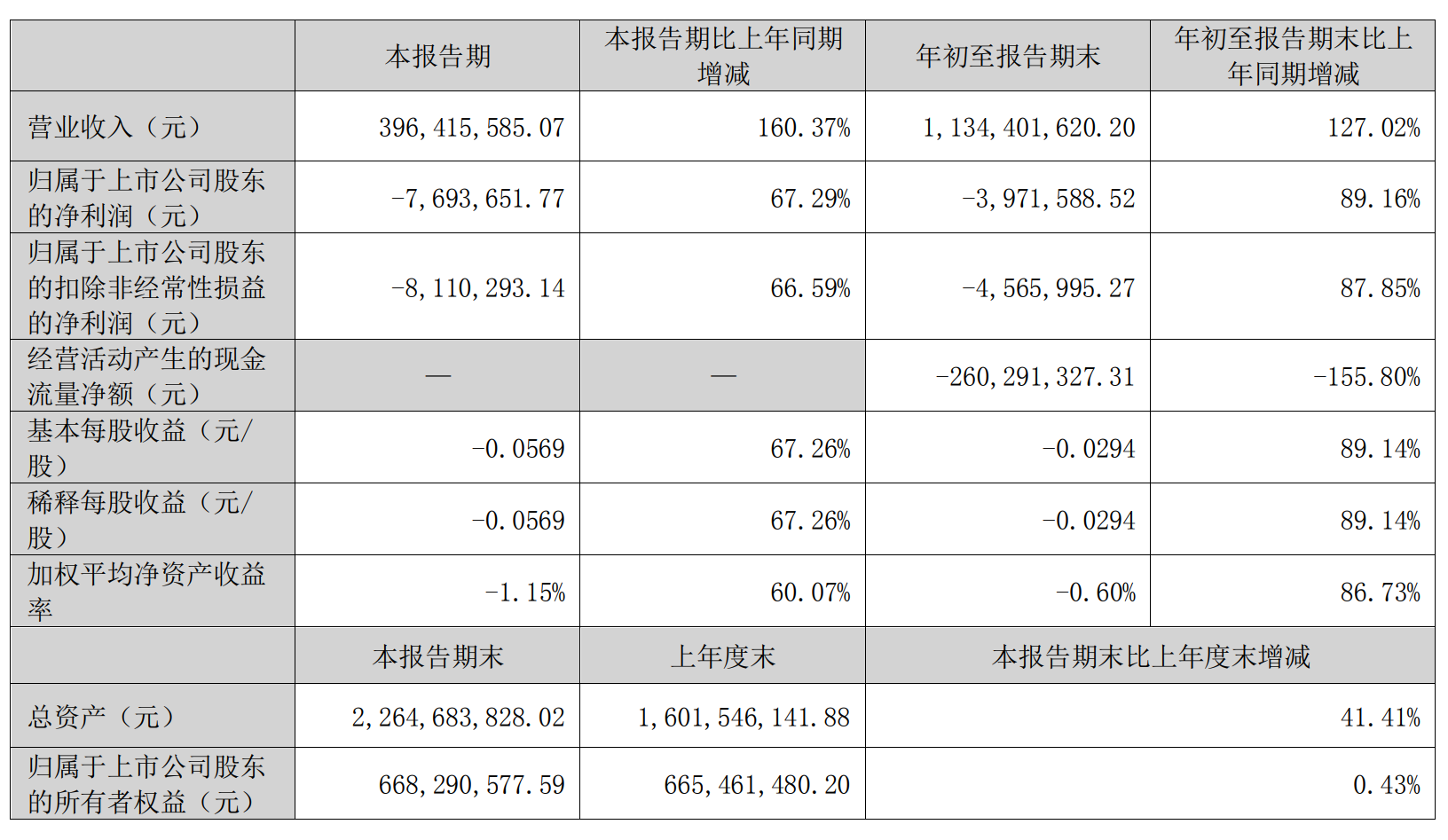 公告显示,美芝股份2022年第三季度营业收入3.96亿元,同比增加160.37%;归属于上市公司股东的净利润为-769.37万元,同比增加67.29%。前三季度实现营业收入11.34亿元,同比增加127.02%;归属于上市公司股东的净利润-397.16万元,同比增加89.16%。