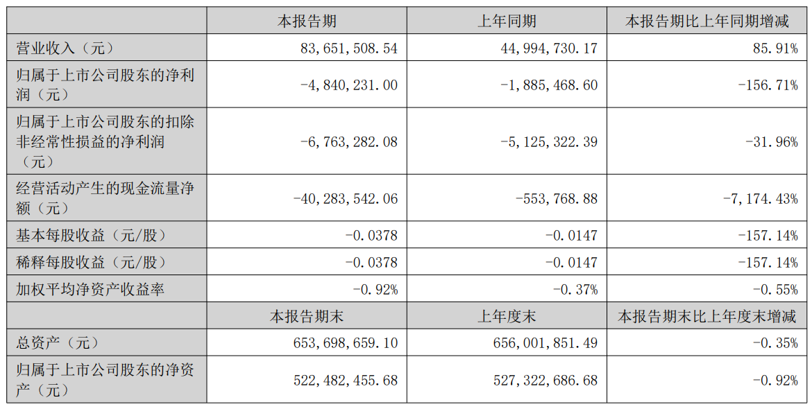 8月25日晚间,三晖电气发布半年报称,上半年归属于母公司所有者的净利润亏损484.02万元,上年同期净亏损188.55万元,亏损扩大;营业收入8365.15万元,同比增长85.91%;基本每股收益-0.0378元,上年同期基本每股收益-0.0147元。