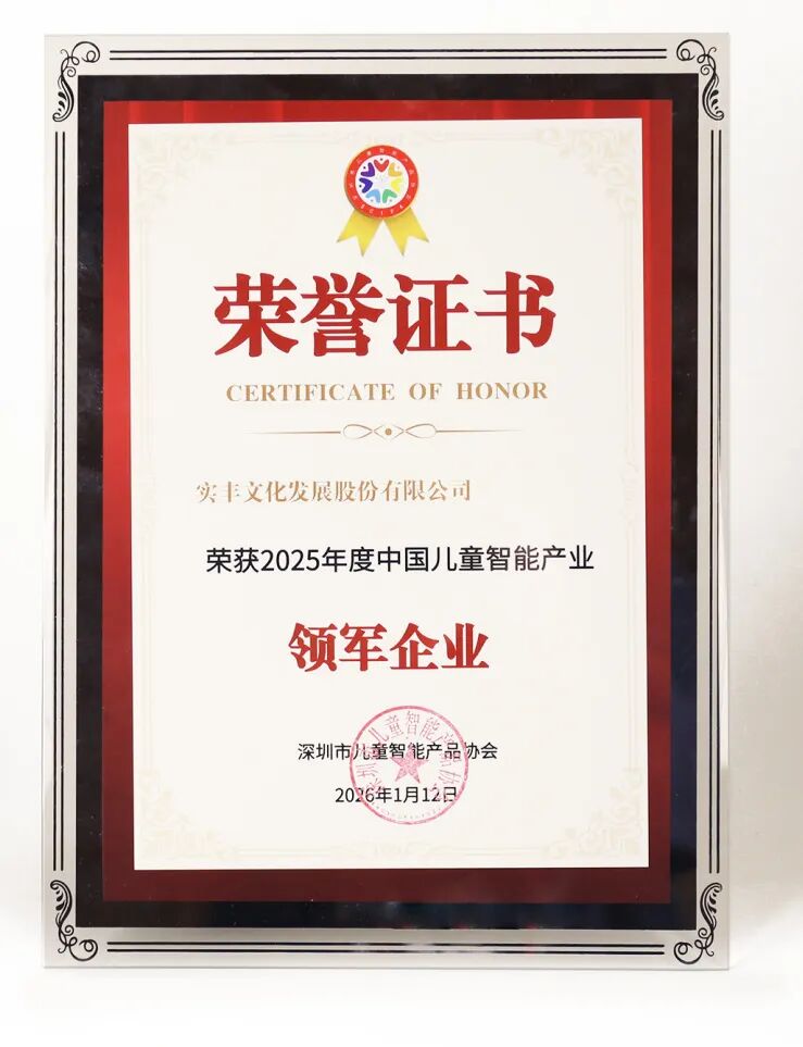 近日,第八届中国儿童智能产业大会在深圳举办,深圳市儿童智能产品协会牵头搭建产业交流平台,汇聚行业精英共探儿童智能产业发展新路径。实丰文化发展股份有限公司(以下简称“实丰文化”、股票代码:002862)受邀参展,携多款前沿AI玩具产品精彩亮相,凭借科技与童趣融合的创新体验,荣获“2025年度中国儿童智能产业领军企业”称号。