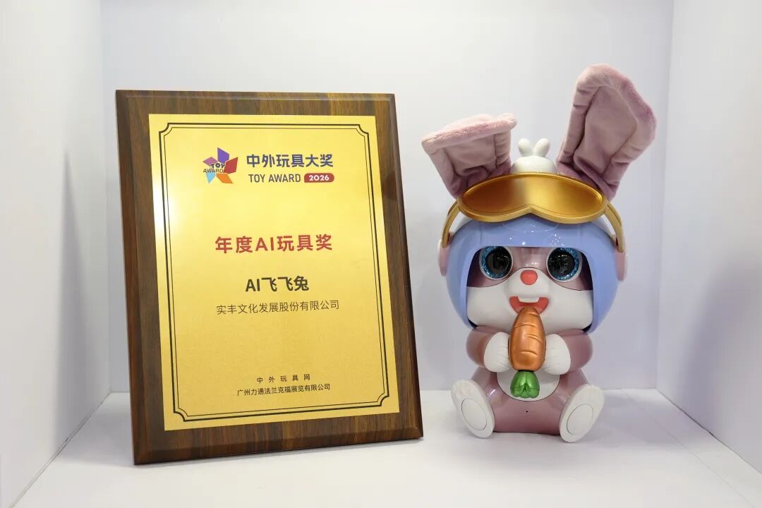 4 月 8 日,实丰文化旗下自研 AI 玩具产品——AI 飞飞兔,凭借出色设计和丰富功能,在 2026 中外玩具&潮玩大奖中荣获“年度 AI 玩具奖”!