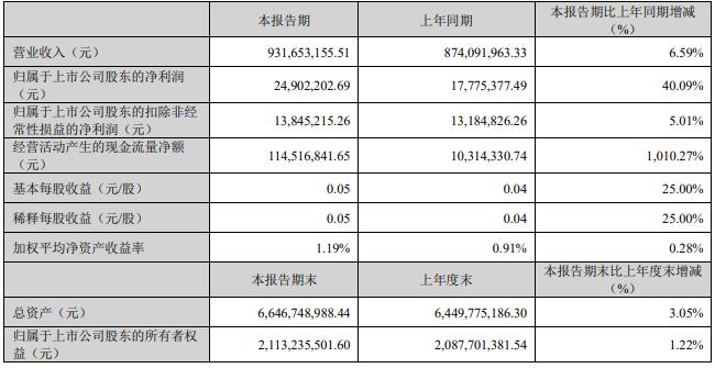 今飞凯达2023年第一季度报告显示,2023年一季度,今飞凯达实现营业收入9.32亿元,同比增长6.59%;归属于上市公司股东的净利润2490.22万元,同比增长40.09%;归属于上市公司股东的扣除非经常性损益的净利润1384.52万元,同比增长5.01%;经营活动产生的现金流量净额1.15亿元,同比增长1010.27%。