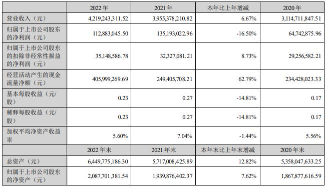 4月26日,今飞凯达发布2022年年度报告。2022年,今飞凯达实现营业收入42.19亿元,同比增长6.67%;归属于上市公司股东的净利润1.13亿元,同比下滑16.50%;归属于上市公司股东的扣除非经常性损益的净利润3514.86万元,同比增长8.73%;经营活动产生的现金流量净额4.06亿元,同比增长62.79%。