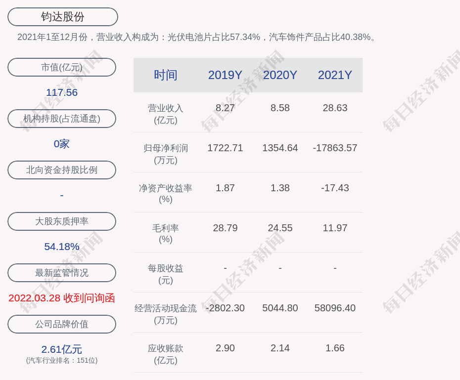 2021年1至12月份,钧达股份的营业收入构成为:光伏电池片占比57.34%,汽车饰件产品占比40.38%。