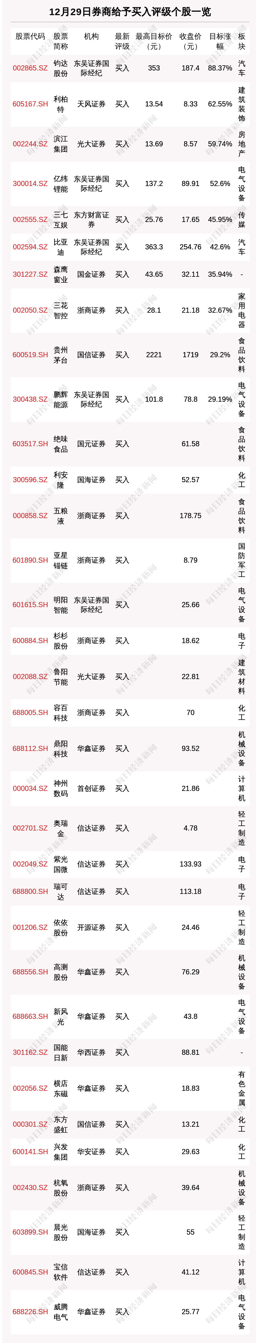 12月29日,券商给予评级的个股数共有58只,获得买入评级的个股数共有34只。在公布了目标价格的10只个股中,按照最新收盘价计算,预期涨幅排名居前的个股是钧达股份(002865.SZ)、利柏特(605167.SH)、滨江集团(002244.SZ),预期涨幅分别是88.37%、62.55%、59.74%。