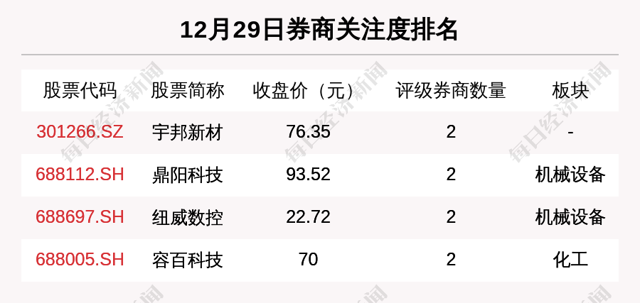 从券商对个股的关注程度来看,有4只个股获得多家券商关注,券商关注数量排名居前的个股是宇邦新材(301266.SZ)、鼎阳科技(688112.SH)、纽威数控(688697.SH)。