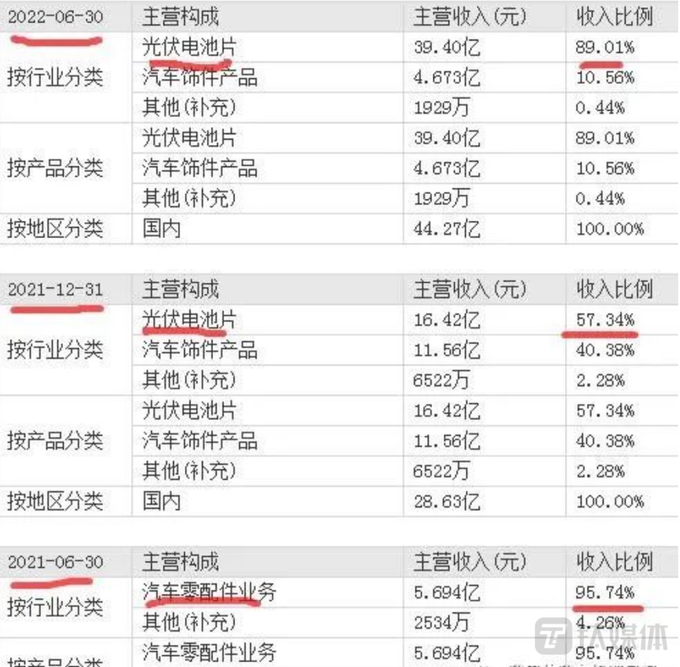 为扭转困局,钧达股份开始“瘦身”,剥离增长乏力、亏损严重的汽车饰件业务,并于2021年9月完成了收购捷泰科技51%股权,从而取得捷泰科技控制权,由此成功切入光伏赛道。从2022年三季度财务报表可知,随着业务发展公司主营业务几乎90%都是光伏电池片,而之前的汽车配件则缩减到只有10%。