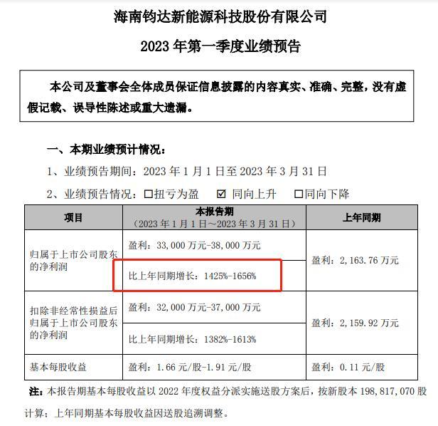 钧达股份公布一季度业绩预告称,净利预增1425%-1656%。