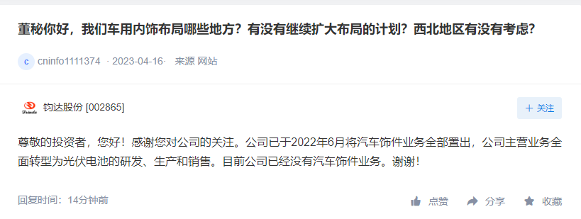 钧达股份4月19日在互动平台回答投资者提问时表示,公司已于2022年6月将汽车饰件业务全部置出,公司主营业务全面转型为光伏电池的研发、生产和销售。目前公司已经没有汽车饰件业务。