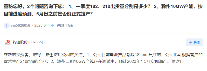 钧达股份4月19日在互动平台回答投资者提问时表示,公司目前电池产品都是182mm尺寸的,公司也可根据客户的需求生产210mm的产品。滁州二期10GW产线正在调试中,预计2023年4-5月实现满产。