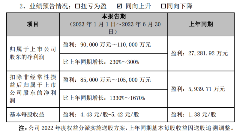 近日,钧达股份发布2023年上半年业绩预告,数据显示,公司预计2023上半年净利润9亿元-11亿元,同比增长230%-300%。