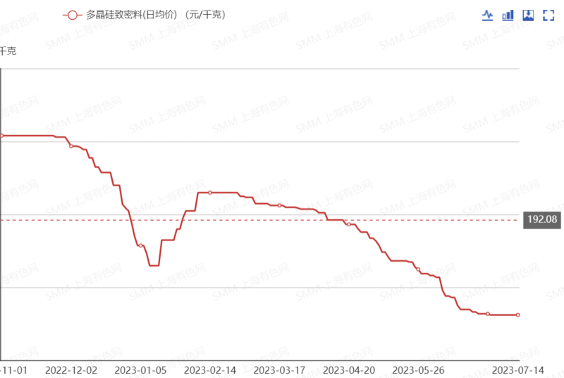 提及上游硅料价格持续下行,据SMM历史价格显示,以多晶硅致密料为例,其现货价格自2022年11月下旬便开始快速下行,一度跌至130元/千克的阶段低位,随后在1月13日之后迎来一段时间的上行,最高回调至230元/千克,随后“一蹶不振”进入下行通道,截止6月30日,多晶硅致密料现货均价降至64元/千克,较2022年12月30日的189元/千克下跌125元/千克,跌幅达66.14%。