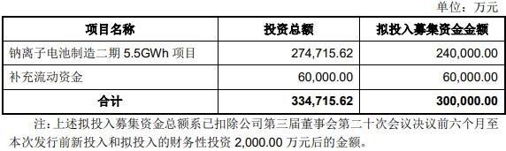 本次向特定对象发行募集资金总额不超过30.00亿元(含本数),扣除发行费用后拟将全部用于钠离子电池制造二期5.5GWh项目、补充流动资金。