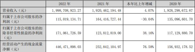 据传艺科技2022年年报,报告期内,公司实现营业收入19.99亿元,同比增长4.07%;归属于上市公司股东的净利润1.15亿元,同比减少30.04%;归属于上市公司股东的扣除非经常性损益的净利润1.71亿元,同比增长38.16%;经营活动产生的现金流量净额4.46亿元,同比增长76.58%。