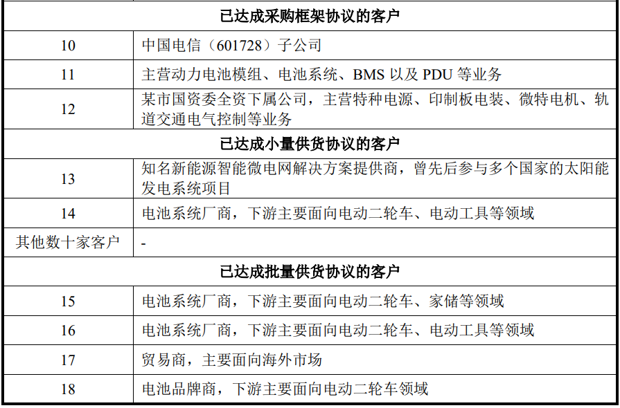 据了解,截至目前,传艺科技在钠离子电池方面的主要客户有18家,其中,已达成采购框架协议的客户的有“中国电信(601728)子公司”“主营动力电池模组、电池系统、BMS以及PDU等业务”等,明确达成供货协议的客户有“知名新能源智能微电网解决方案提供商,曾先后参与多个国家的太阳能发电系统项目”“电池系统厂商,下游主要面向电动二轮车、电动工具等领域”“贸易商,主要面向海外市场”等。