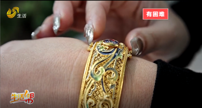 临沂平邑的王先生在二十周年结婚纪念日在银座周大生专柜购买了一只重87.06克的足金带珐琅彩手镯,标价4740元。