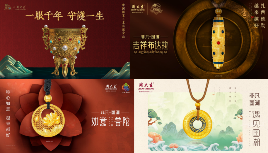 关注国潮文化和黄金发展的周宗文,在此次“手镯节”中将二者进行了完美的结合。活动中推出的饰品,大多是品牌携手“藏地佛教文化领军IP”、“观世音菩萨福佑文化IP”、“佛国普陀山”以及汇集了故宫、敦煌等27+著名博物馆、荟萃了80+国宝级馆藏文物重磅打造的“国家宝藏”、“布达拉宫”、“如意普陀”以及“遇见国潮”等中国文化IP系列产品,通过“文创+国潮+珠宝”的形式,将优秀传统文化和千年情感文化注入珠宝当中,创造出中国文化与黄金珠宝设计共融的更多可能性,同时也赋予千年文化与深厚情感新时代内涵,全新演绎中国文创潮流概念。