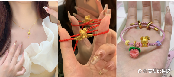 兔年系列全面开花,在新工艺-闪耀金的基础上创新形态,打造了极具年轻人喜爱的“闪光兔”,上线即爆款,也在双十一跃升“黑马”,成为月销1000+的爆款单品;不仅如此,周大生还发挥原创优势,打造大众喜爱度超高的大眼“有钱兔”,diy手绳一度风靡社交媒体;