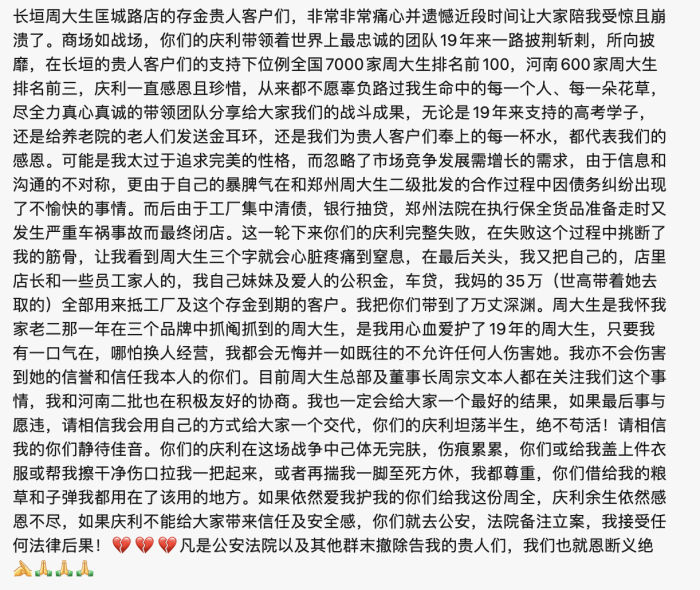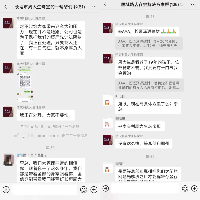 根据爆料人提供的截图,李庆利在面向部分存金客户的微信群中解释称,金店关门的主要原因是和“郑州周大生二级批发”产生债务纠纷,导致“工厂集中清债,银行抽贷”,而“郑州法院在执行保全货品准备走时又发生严重车祸事故而最终闭店”。