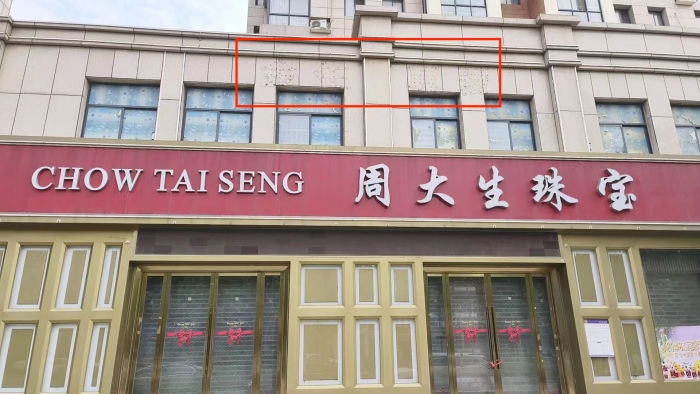 在周大生匡城路店的门头上,还隐约可见“金生真爱”招牌字被拆下的痕迹。图片来源:爆料人