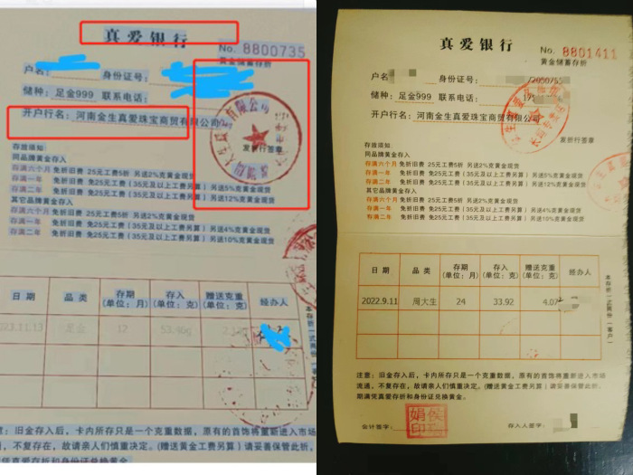 这份“存折”也与银行存折相似,上面印有“真爱银行”四个字,以及“户名”、“开户行名”等,还盖上了公章。蹊跷之处在于,“存折”上开户行名并非周大生关联公司,而是“河南金生真爱珠宝商贸有限公司”,所盖公章是“金生真爱名品馆长垣专卖店”。界面新闻看到的另一份“黄金储蓄存折”,上面盖的公章又变成了“深圳周大生珠宝有限公司长垣专卖店”。
