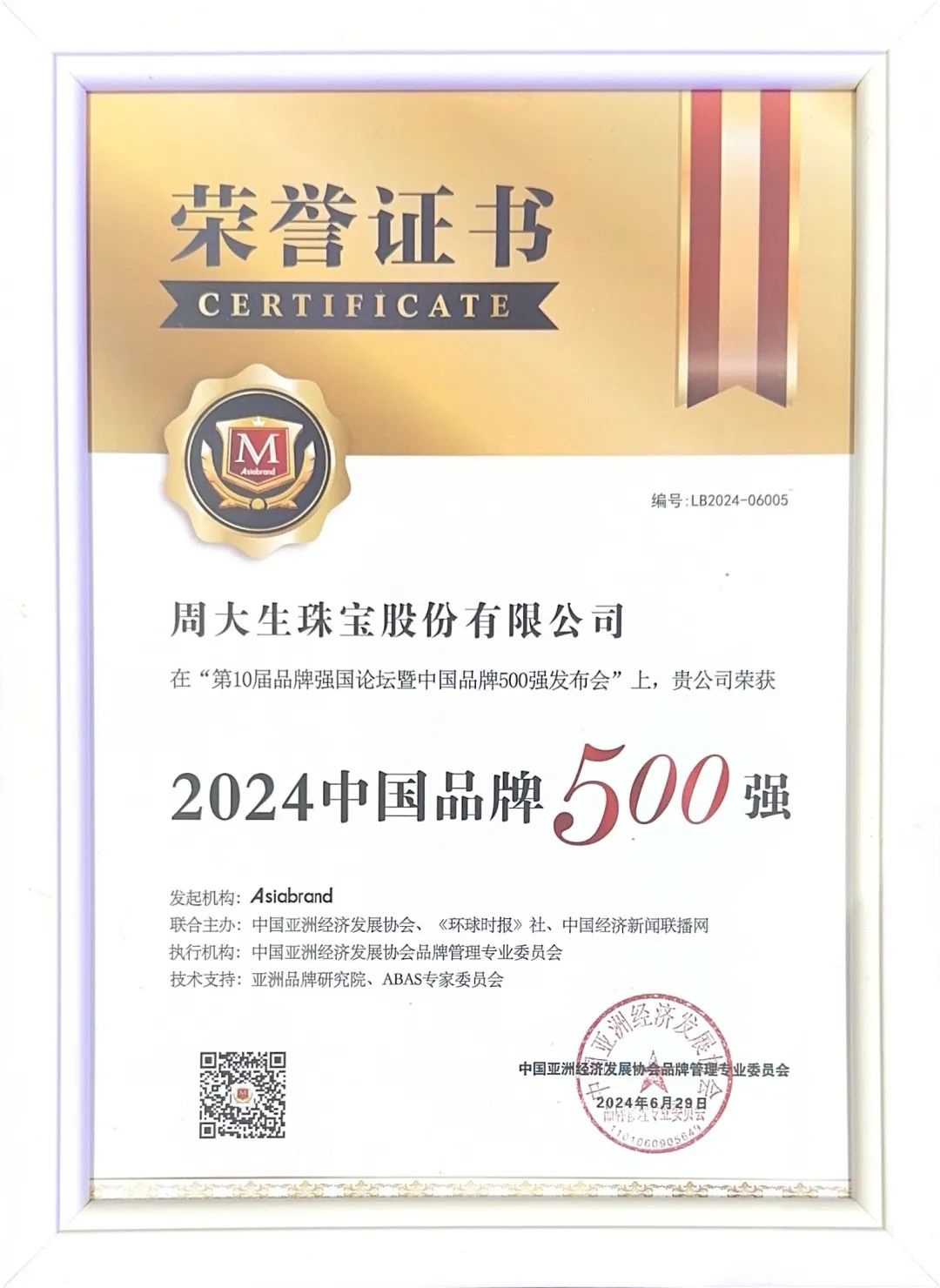 经过严格的评选,周大生珠宝以其卓越的品牌实力和持续的创新精神,荣获“2024中国品牌500强”荣誉称号,董事长周宗文获评“2024中国品牌百名优秀企业家”。