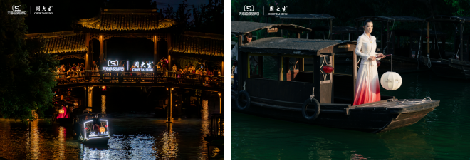 同时,为了给七夕线下活动创造更加独特的品牌体验,周大生在作为中国首批十大历史文化名镇和中国十大魅力名镇,有着“中国最后的枕水人家”美誉的乌镇,巧妙地将乌镇的古典韵味与珠宝的现代时尚相融合,于发光博物馆之外,精心策划了一场前所未有的16条摇橹船珠宝大秀,这一创新珠宝秀场,再现东方雅韵的举措为这个七夕佳节增添了一抹不可复制的浪漫与光芒;除此之外周大生还积极联动5A级景区-乌镇在线上开展官号内容联动,实现了品牌与景点合作的双向共赢。