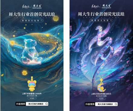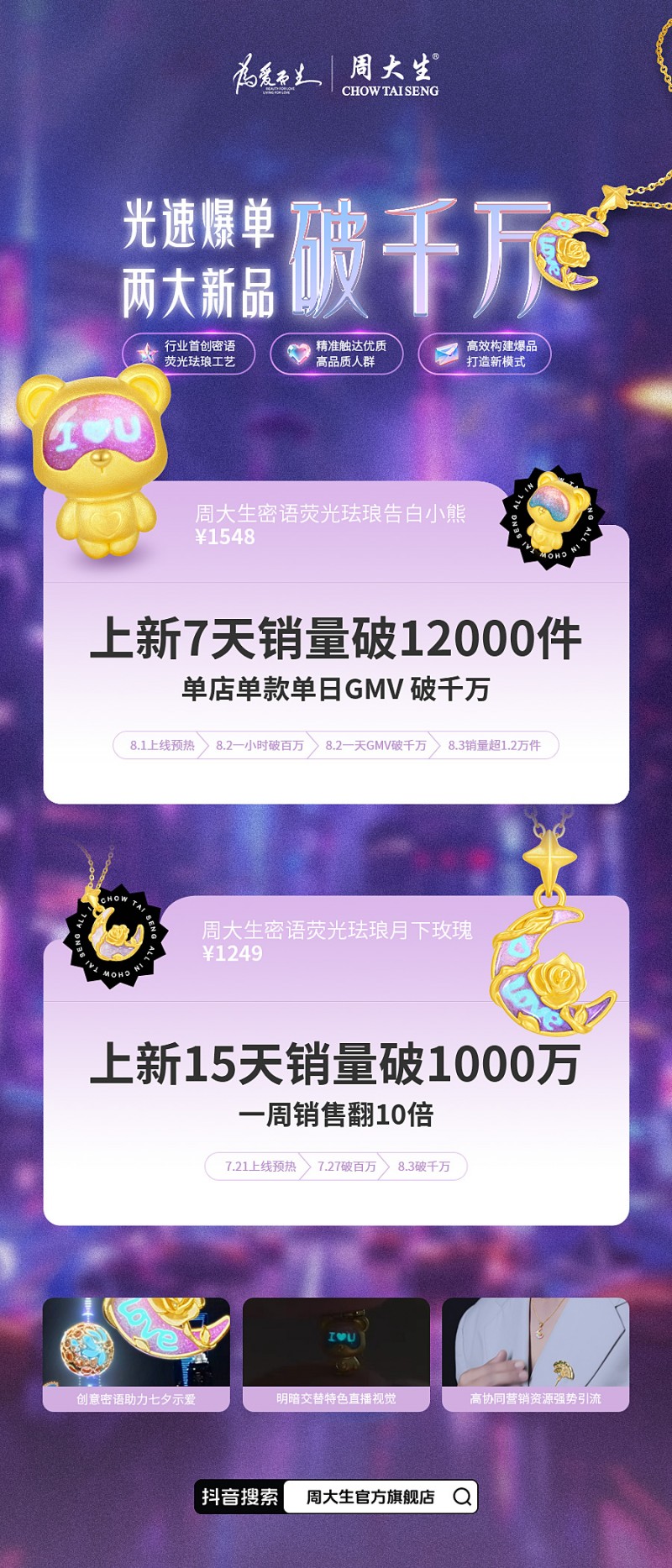 周大生天猫超级品牌日超级尖货更是在荧光珐琅工艺“会发光的金子”的基础上再升级,结合七夕消费者告白、示爱的情感需求,叠加密语荧光珐琅的浪漫设计,打造出周大生荧光珐琅告白蜜糖小熊和周大生荧光珐琅黄金月下玫瑰吊坠2款“会说话的金子”天猫百万爆品;同时,在抖-音周大生官方旗舰店周大生荧光珐琅告白蜜糖小熊更是上新仅7天,就实现销量破12000件,单店单款单日GMV破千万;另一超级尖货周大生密语荧光珐琅月下玫瑰,上新15天销量破1000万,一周销售实现翻10倍的亮眼成绩。