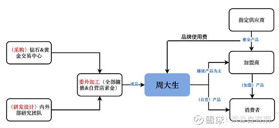 针对这种情况,周大生开创业内商业创新,在采购端,对于主力产品钻石,公司采用“委外加工”(利润低)、买断采购(利润高)的方式;对于引流产品黄金,公司选择指定供应商(利润低),采取品牌授权(利润高)的模式。