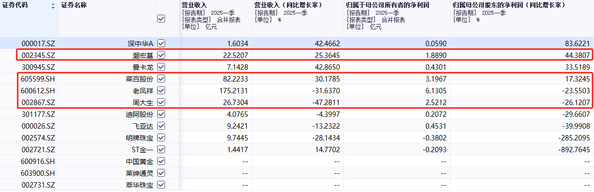 净利润过亿元的企业中,潮宏基(002345.SZ)、菜百股份(605599.SH)同比增长,老凤祥(600612.SH)、周大生(002867.SZ)则出现大幅下滑。