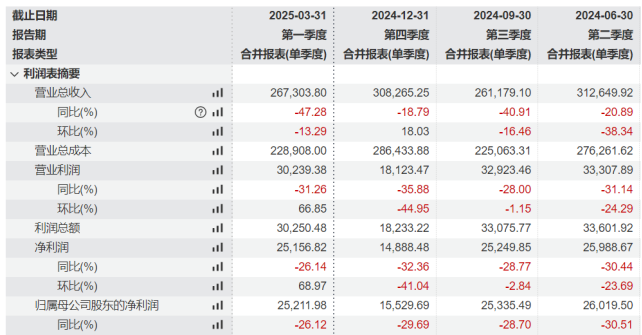 证券之星了解到,由于珠宝首饰消费市场承压,自2024年二季度起,行业便掀起了闭店潮,其中周大生于2024年上半年撤减终端门店173家,全年累计撤减门店高达761家,2024年净减少98家门店。除了缩减门店规模以应对行业压力外,2024年下半年,周大生还推出子品牌“转珠阁”加大非黄金产品销售,更早前的2023年,公司还推出国家宝藏主题门店,进一步向高端化延伸。不过此类业务探索短期内难以支撑公司业绩,今年一季度,公司延续疲软态势,营收和归母净利润分别大幅下降47.28%和26.12%,这也是公司自2024年第二季度起连续4个季度业绩呈现双降。
