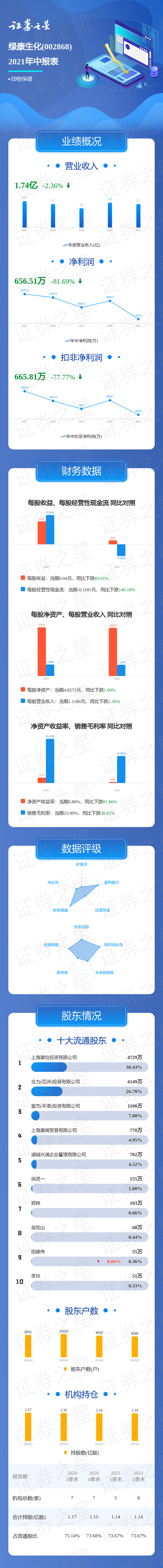绿康生化2021中报显示,公司主营收入1.74亿元,同比下降2.36%;归母净利润656.51万元,同比下降81.69%;扣非净利润665.81万元,同比下降77.77%;负债率24.45%,投资收益-241.65万元,财务费用102.48万元,毛利率23.9%。