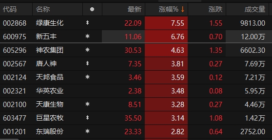 1月11日早盘,申万一级行业板块中,农林牧渔板块开盘拉升。截至9时34分,绿康生化涨超7%,新五丰涨逾6%,神农集团、唐人神、天邦食品等跟涨。