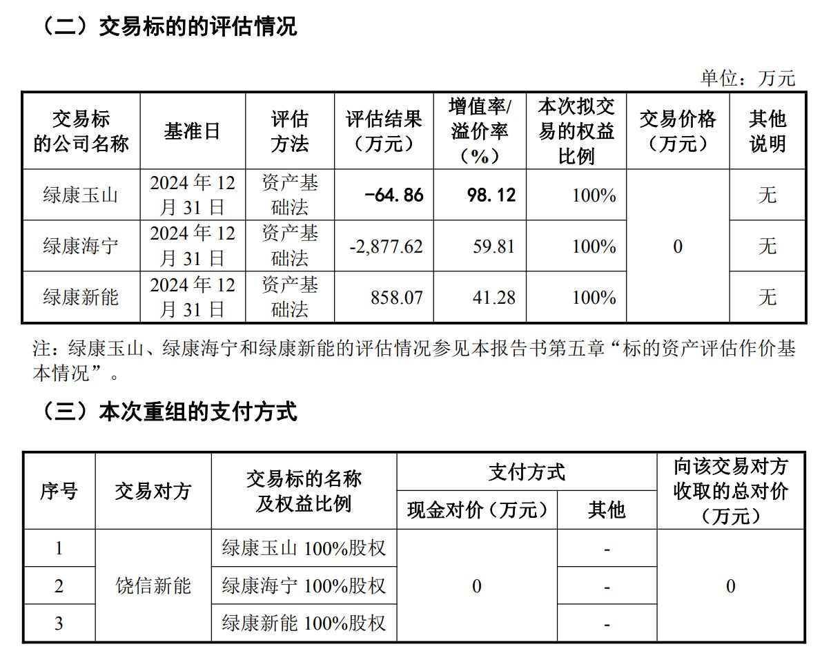 “经交易双方友好协商,绿康玉山100%股权、绿康海宁100%股权和绿康新能100%股权的全部股东权益交易对价合计为0元,高于三家标的公司的合计评估值,不存在损害上市公司和中小股东利益的情形。”*ST绿康表示。