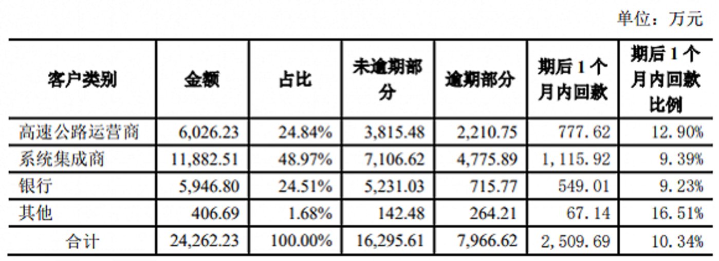 据公司招股说明书显示,2016年底公司的应收账款主要由三类客户组成,分别是高速公路运营商、系统集成商和银行,他们都存在不同程度的逾期情况,其中系统集成商和高速公路运营商应收账款逾期较为严重,逾期部分占比分别为40%和36.7%。